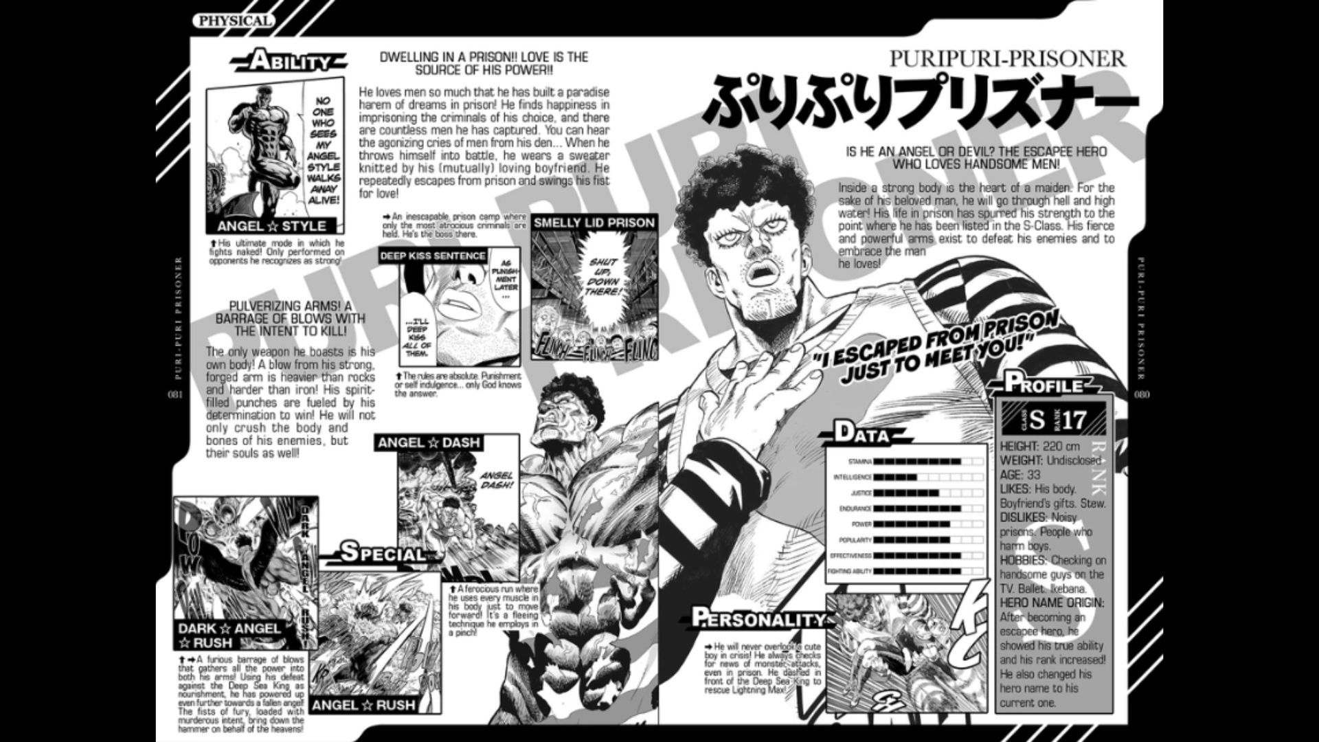 Puri Puri Prisoner's battle strategy is physically combative, founded on strong melee attacks and a transformation method he calls "Angel Style." Although not quite as one-sided as top-tier heroes such as Tatsumaki or Atomic Samurai, he compensates with the ability to take abuse and a refusal to quit, often battling on even when badly hurt.