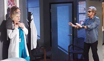 Suddenly worried, Marlena stumbled toward the bedroom door while stammering that Hattie needed to leave right away. "Feeling a little wobbly?" Hattie guessed, leaving Marlena even more concerned. "Oh, calm down! Come on! I may have run a con now and then, but I never killed nobody. You'll be fine," Hattie dismissively assured Marlena.