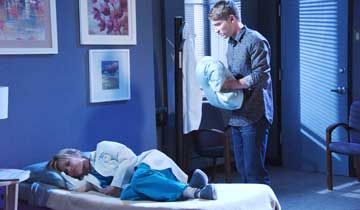 Elsewhere, a nurse informed Tripp that Kayla was napping in the on-call room. Tripp crept into the on-call room and quietly closed the door. Recalling the things Angelo had said earlier, Tripp grabbed a pillow and squeezed it tightly as he approached Kayla's cot.